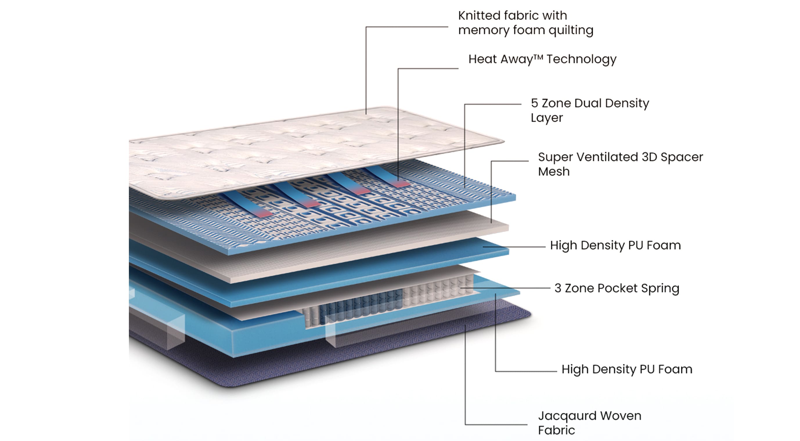 A pocket spring mattress with memory foam, Posture Perfect by Duroflex combines the latest orthopedic technologies to help your body unwind at the end of a long day. The core of the mattress features a 3 zoned pocket spring layer, which gives the mattress just the right amount of firmness and bounce. Meanwhile, our exclusive 5 zoned certified orthopedic support, which has been certified by the National Health Academy, offers specialized support to each of the five zones of your body, resulting in the correct alignment of your spine.
