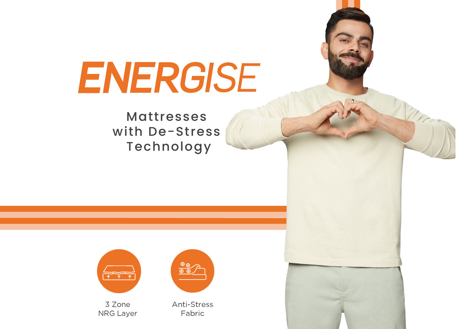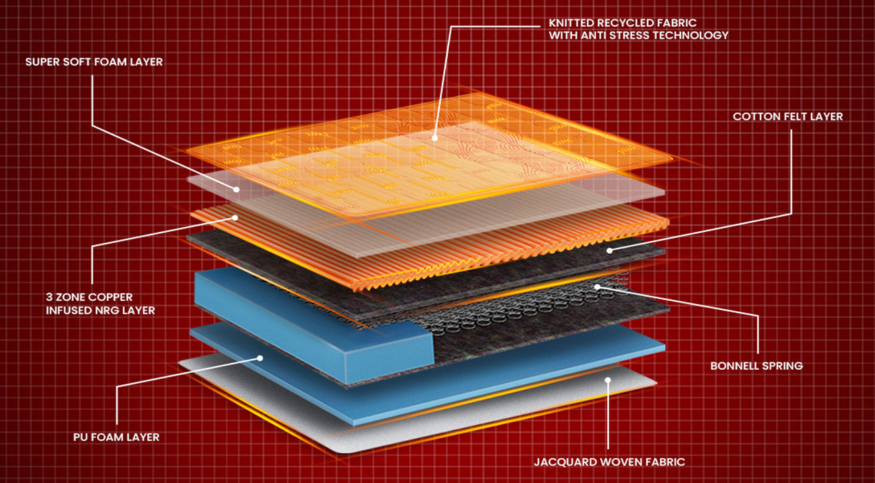 Looking for bouncy comfort? Your search ends with Duroflex Bolte Plus, a bonnell spring mattress with a lush Euro top finish for added plushness. Designed for incredible zonal support, our 3 Zoned Copper Infused NRG Layer makes achieving the perfect sleeping posture a breeze. The smart grooves in the special 3 Zoned NRG Layer along with Copper infusion enable better air circulation keeping the mattress fresh and cool. All this is enhanced by the Anti Stress Technology in the knitted fabric, designed to repel negative ions from your body, leaving you positively energised.