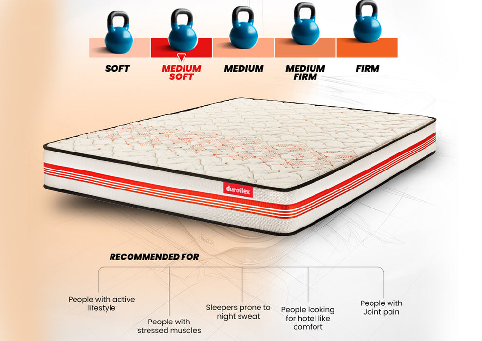 Brand Duroflex Colour Cream Size Double Warranty 10 Years Set Content: 1 Mattress Mattress Thickness 7 Inch Firmness Medium Soft Fabric Stress Technology Mattress Material Pocket Spring -