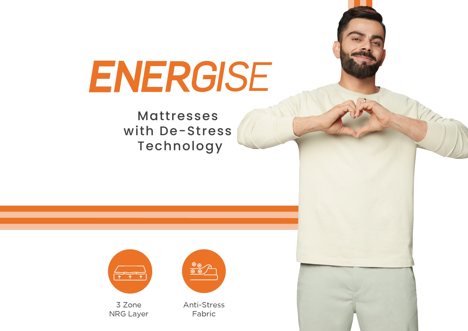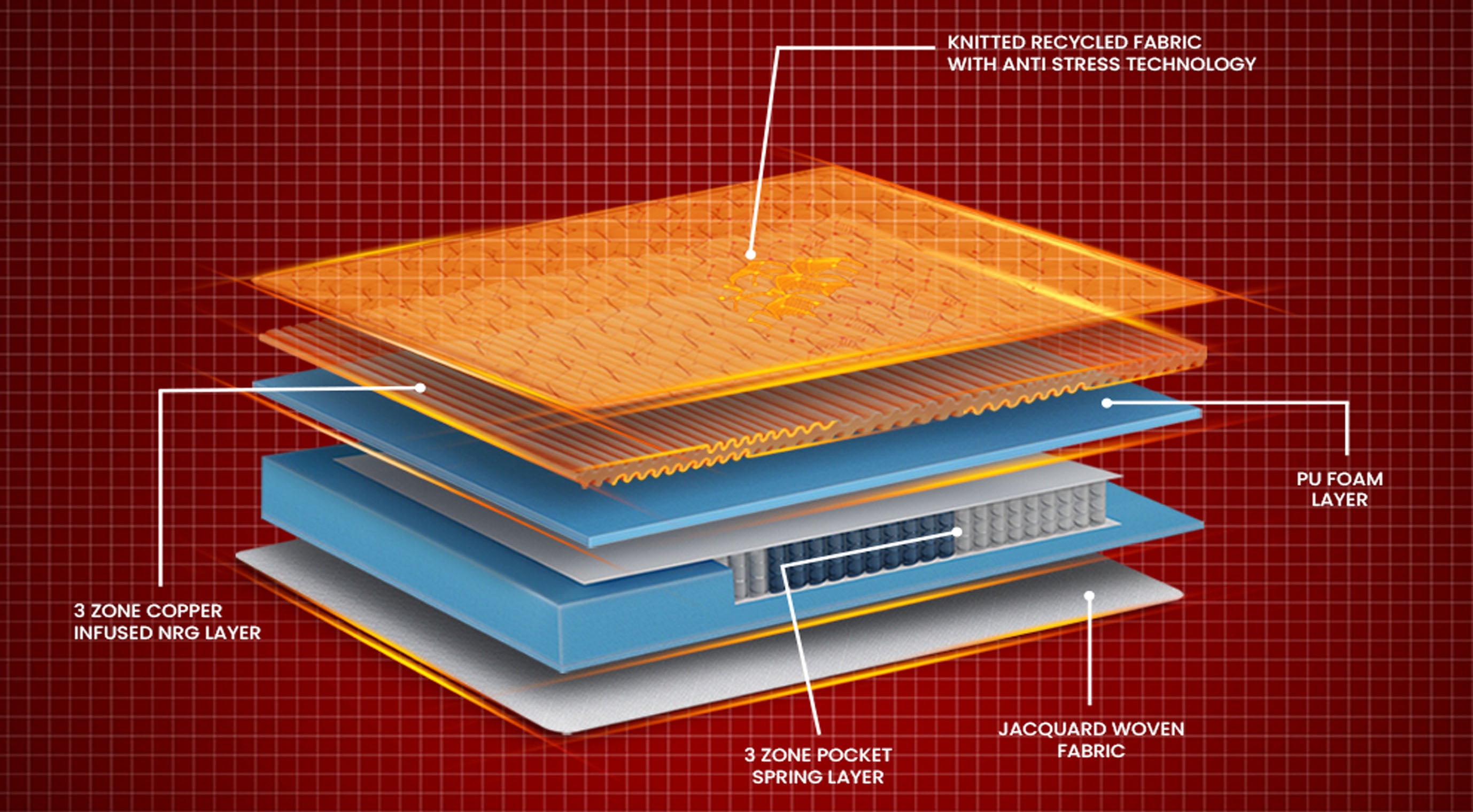 The signature 3 Zoned NRG Layer provides the best zonal support, enabling better blood circulation and muscle relaxation for the most enriching sleep. This exclusive layer comes with Copper-infused gel foam that draws heat away from the body for a cooler and more refreshing sleep. Copper being naturally antimicrobial also makes sure your mattress stay stays safe and hygienic. The mattress features a specialty special Anti Stress Fabric infused with carbon which repels the negative ions in your body when you sleep, leaving your body with a more positive charge for a deeply relaxing sleep.