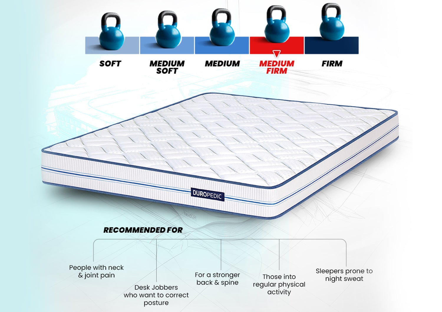 Brand Duroflex Colour White Size King Warranty 5 Years Set Content: 1 Mattress Mattress Thickness 5 Inch Firmness Medium Firm Fabric Knitted Fabric With PU Foam Quilting Mattress Material Adaptive Memory Foam -